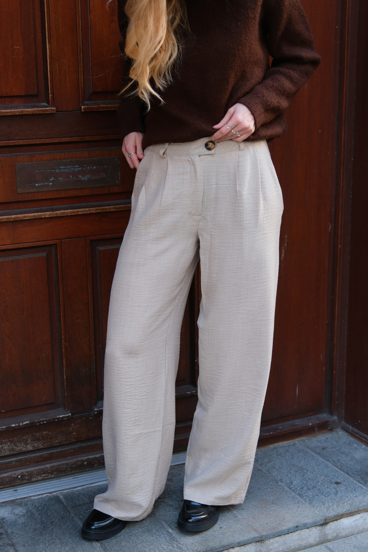 Vores designere har lagt stor vægt på detaljerne, såsom den behagelige talje og de lette foldninger, der tilfører et strejf af elegance. Den løse pasform bidrager til en moderne silhouette, hvor du samtidig bevarer en komfortabel følelse. Kombinationen af et minimalistisk design med funktionelle detaljer sikrer, at disse bukser står som et statement i enhver modebevidst kvindes garderobe.