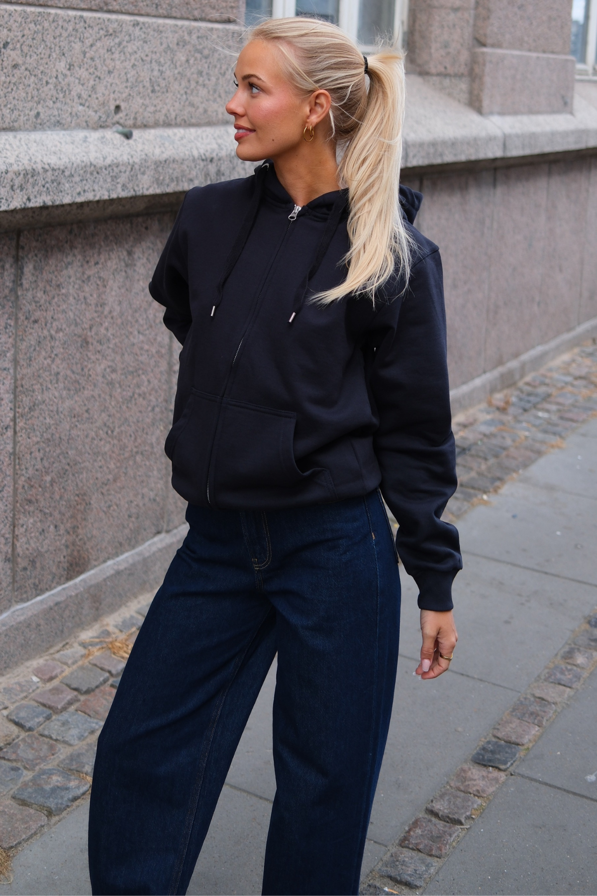 Forestil dig den perfekte hoodie. Den, du griber ud efter på en kølig morgen, den, du tager over dit træningstøj, og den, der fuldender dit afslappede weekend-look. Vores Basic Zip Hoodie i en dyb, elegant Mørk Navy er netop den hoodie. Den er designet til den moderne kvinde, der ikke vil gå på kompromis med hverken komfort eller stil. Hos TeeShoppen mener vi, at basisgarderoben er fundamentet for god stil, og denne hættetrøje med lynlås er en uundværlig klassiker.