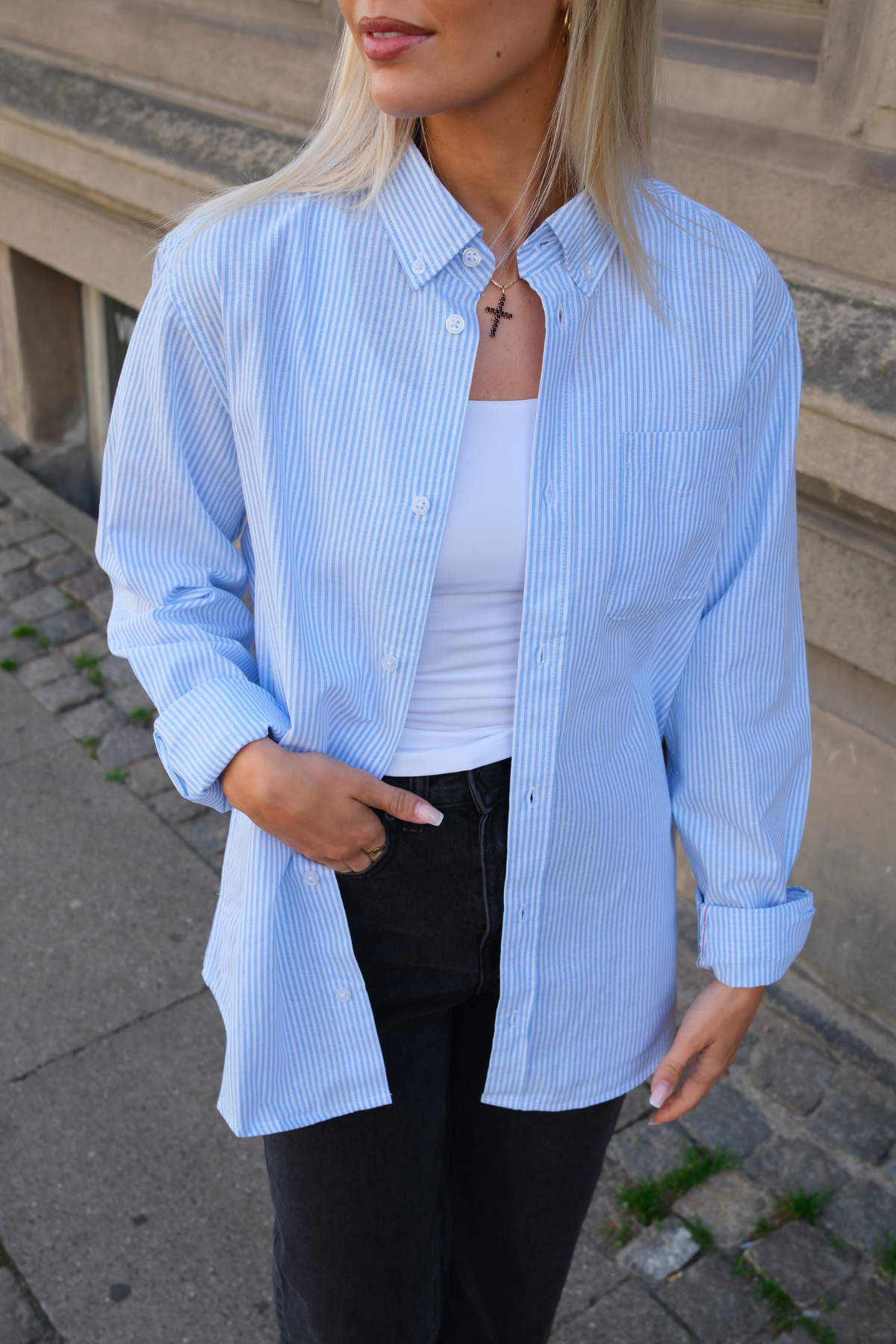 Træd ind i en verden af ubesværet stil og suveræn komfort med vores Boyfriend Oxford Skjorte i en frisk lyseblå og hvid stribekombination. Dette er ikke bare en skjorte; det er en investering i din garderobe, en alsidig klassiker, der ubesværet bygger bro mellem det afslappede og det formelle. Designet til den moderne kvinde, der værdsætter både æstetik og velvære, er denne skjorte fra TeeShoppen skabt til at blive en fast del af dit look, sæson efter sæson.