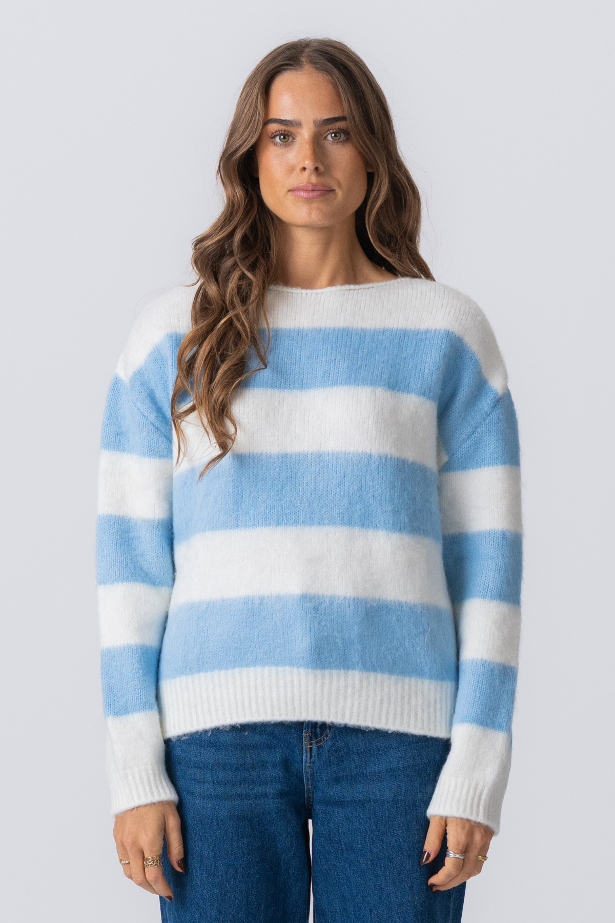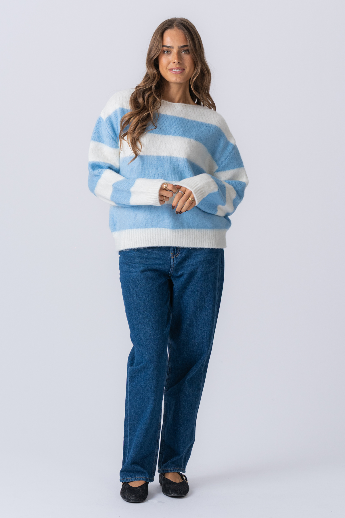 Opdag din nye yndlingstrøje: Celina Stribet Striktrøje. Forestil dig følelsen af en let forårsbrise og en klar blå himmel – den følelse har vi indfanget i denne smukke strik. Med sine klassiske hvide og himmelblå striber er Celina trøjen indbegrebet af ubesværet elegance og maritim charme. Den er designet til den moderne kvinde, der værdsætter både stil og komfort, og som ønsker en garderobe bygget på kvalitet og tidløse styles.