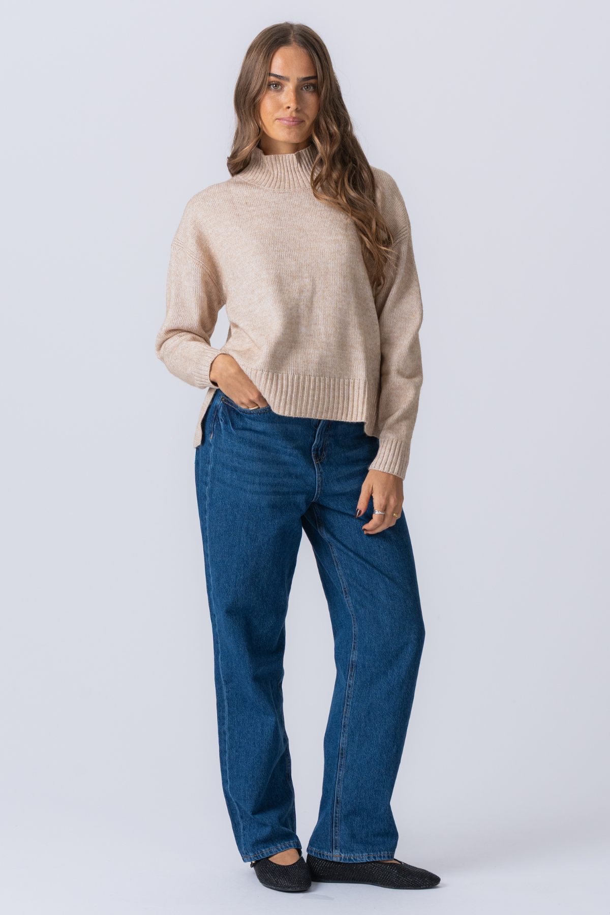 Vævningens Elegance: Oversized Strikket Rullekravetrøje - Beige til Kvinder