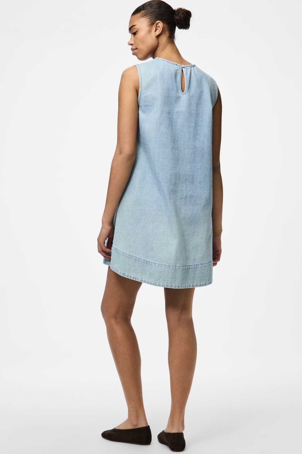Kjolen er fremstillet af en gennemtænkt blanding af 80 procent bomuld og 20 procent genanvendt bomuld. Det betyder at du får den velkendte blødhed fra bomulden samtidig med at du tager et skridt mod en mere ansvarlig garderobe. Materialet føles fantastisk mod huden og sikrer at kjolen holder formen hele dagen lang. Den lyseblå denimvask giver et friskt og ungdommeligt udtryk der passer perfekt til både hverdag og festlige lejligheder.