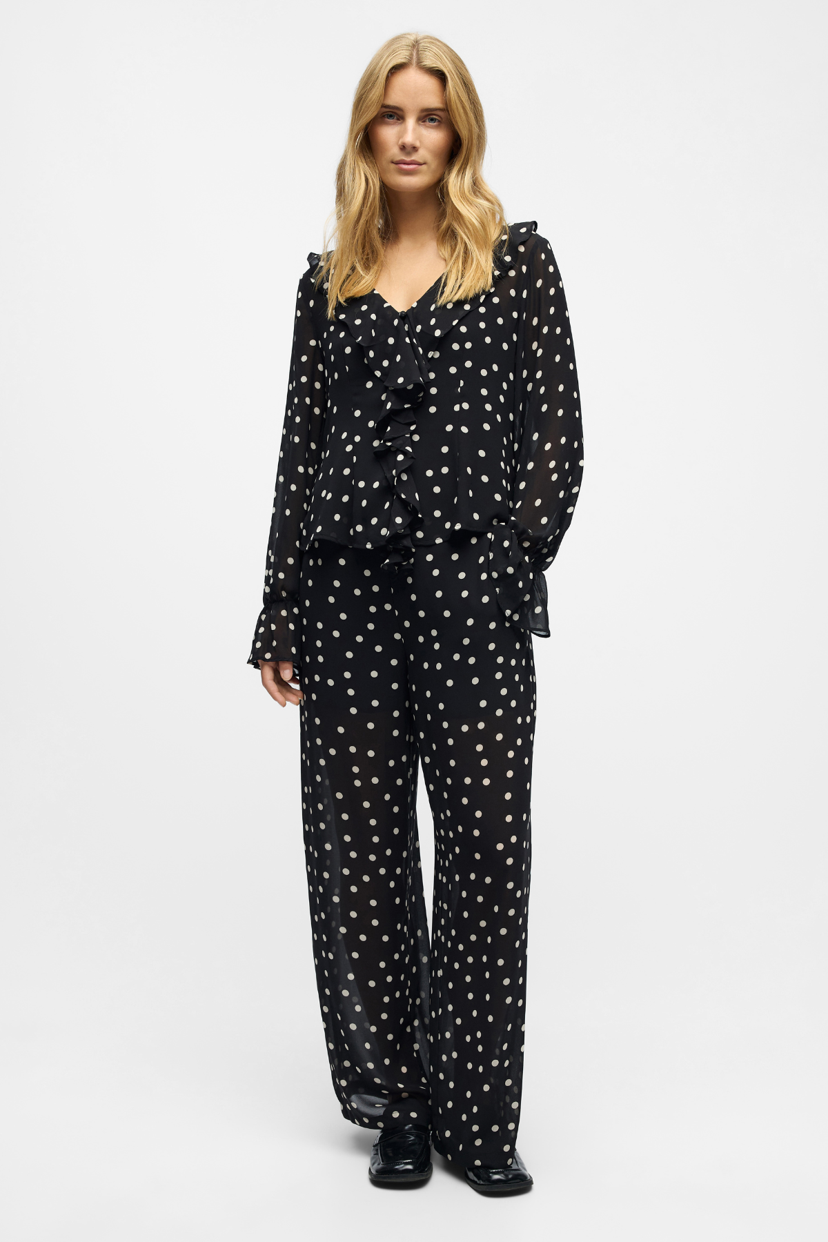 Træd ind i en verden af ubesværet stil med Gina Pants fra Object. Disse bukser er mere end bare et stykke tøj; de er en investering i din garderobe, der kombinerer klassisk design med et moderne og legende twist. Det diskrete, men charmerende mønster med sorte prikker på en dyb sort baggrund tilføjer et unikt element, der får dig til at skille dig ud på den mest sofistikerede måde. Fremstillet i et let og lækkert materiale, falder disse bukser smukt om kroppen og sikrer dig en komfort, der varer hele dagen – uanset om du er på kontoret, til en caféaftale eller på vej til en festlig begivenhed.