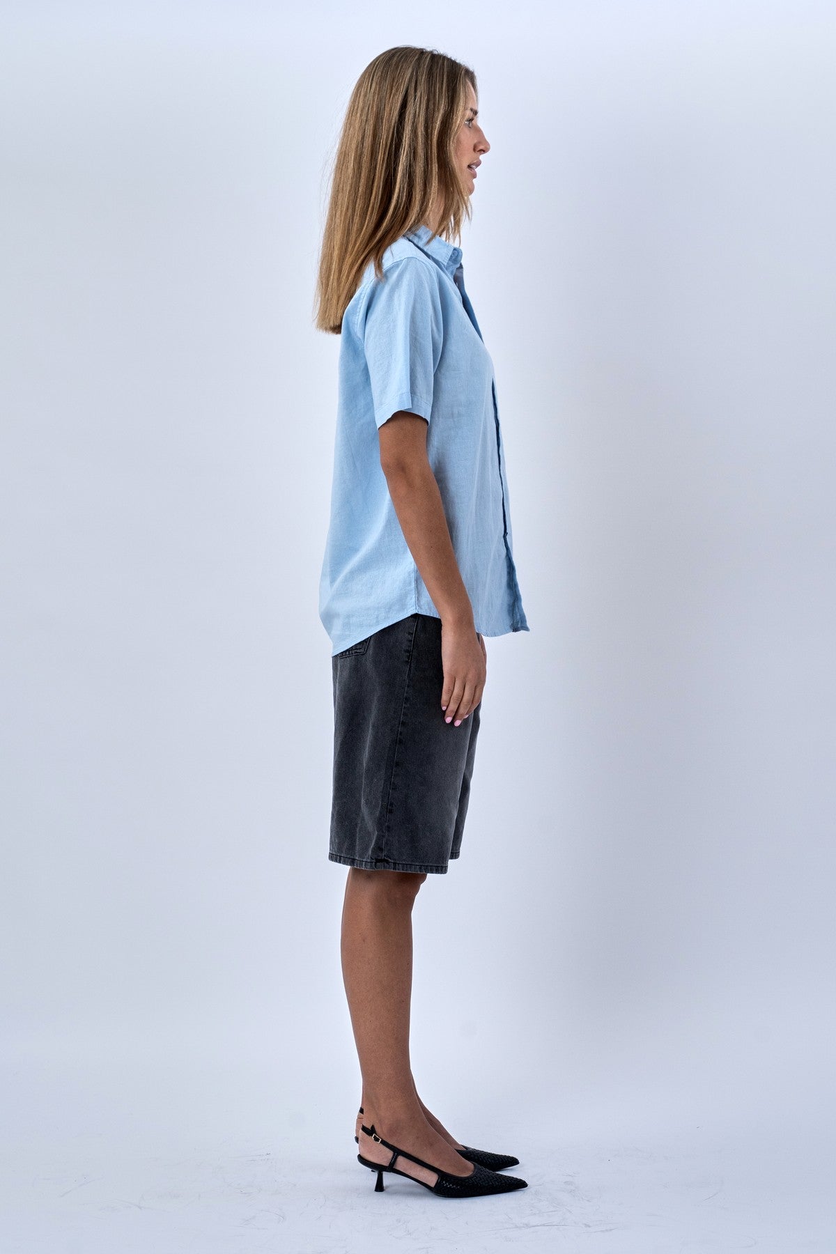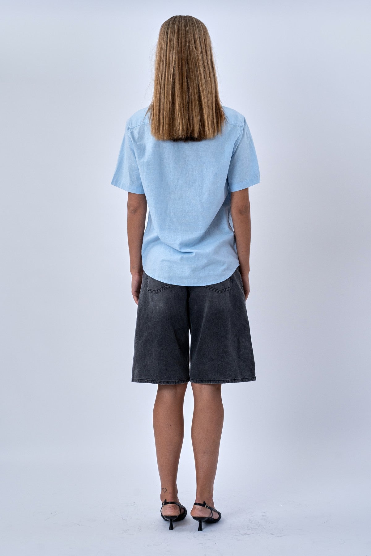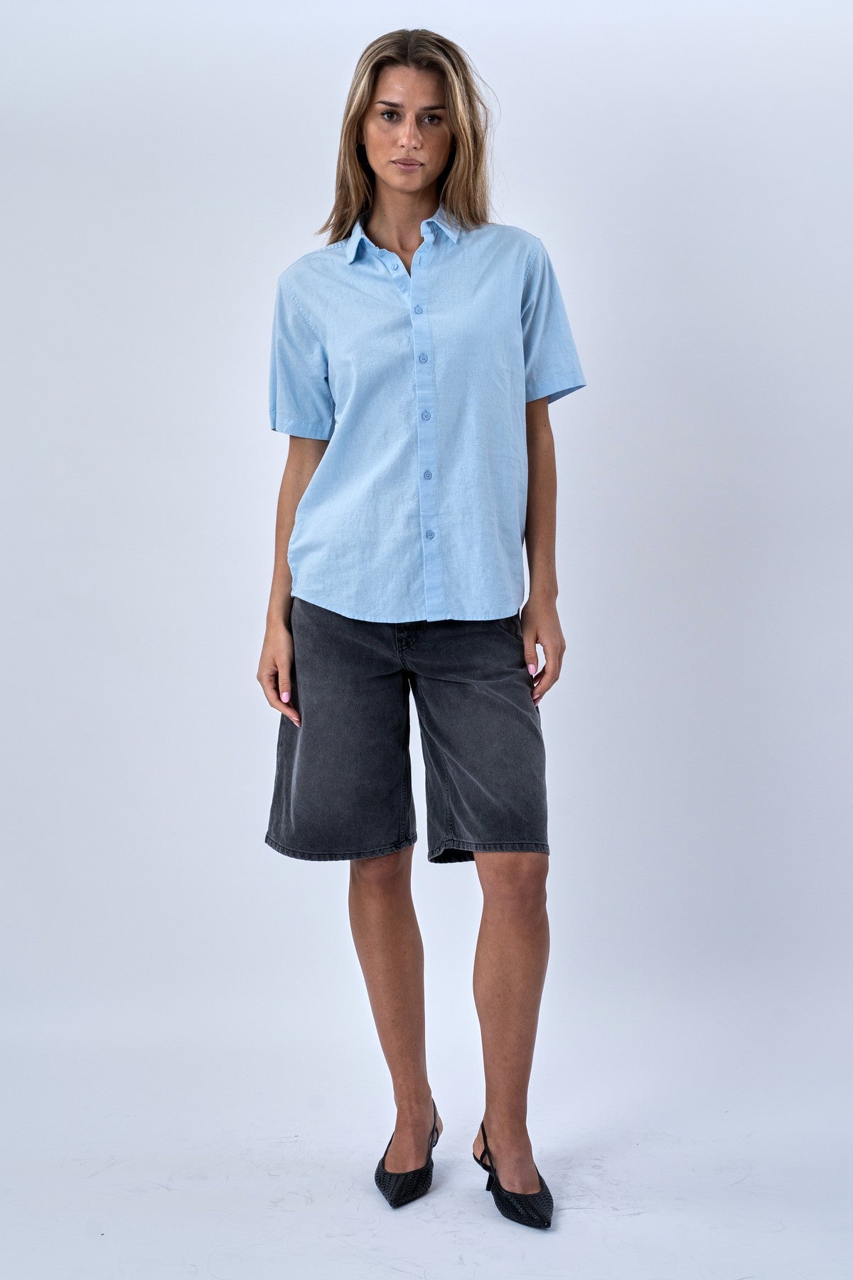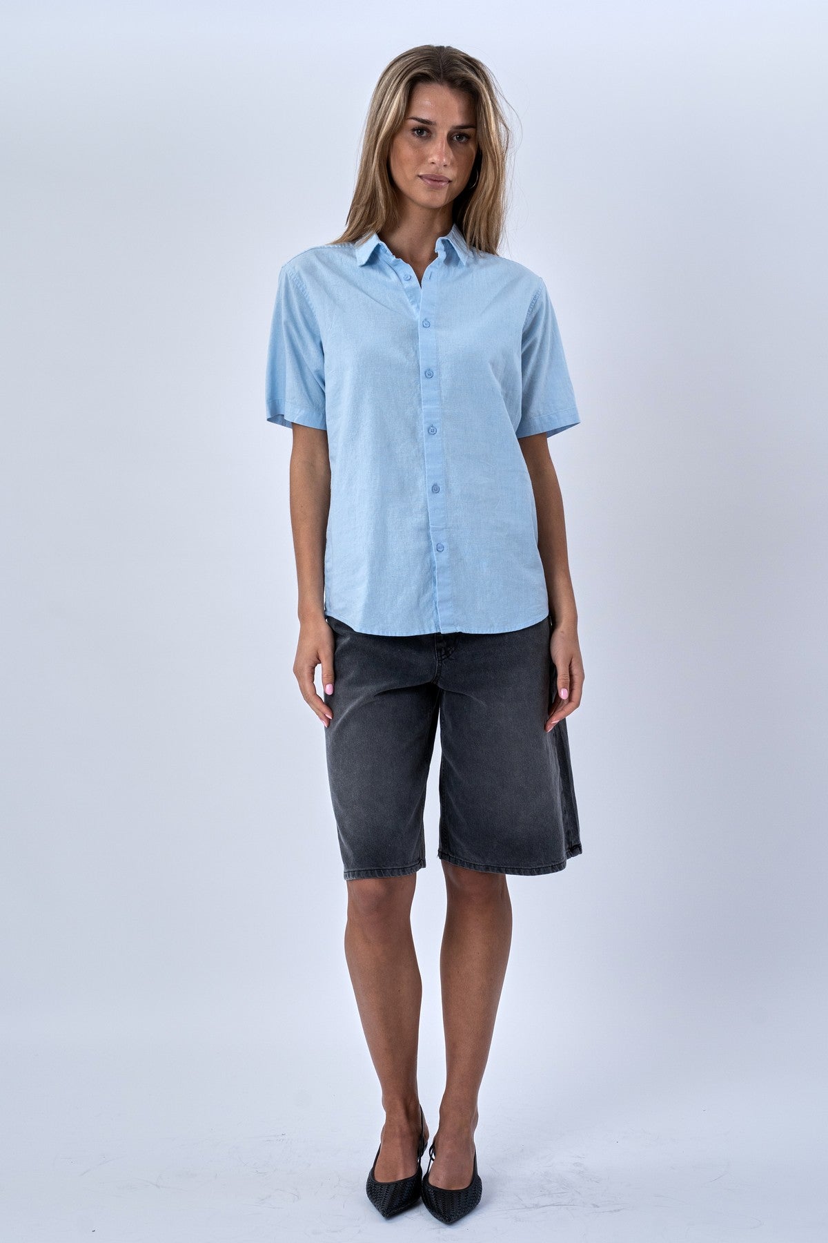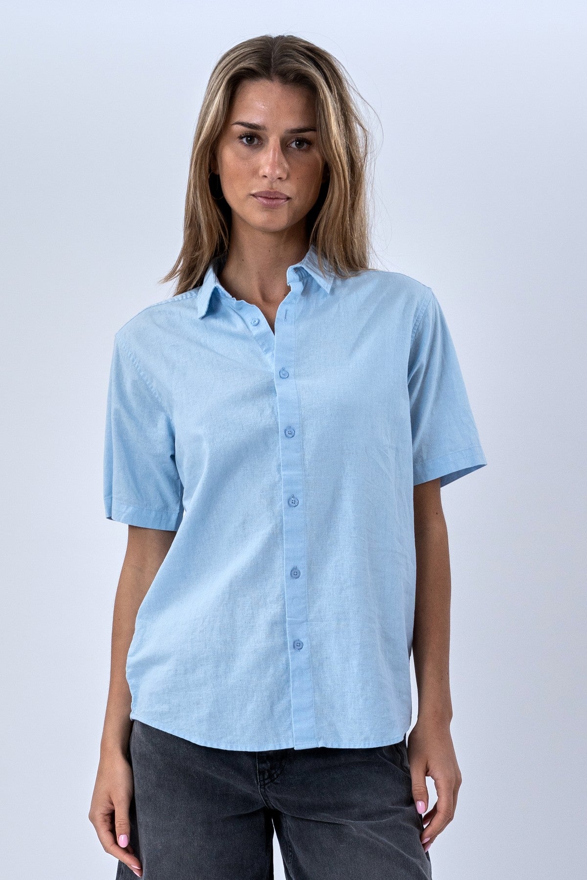 Den delikate lyseblå farve emmer af sommer og solskin. Den er utrolig nem at style og passer perfekt ind i enhver garderobe. Skjortens design er klassisk med korte ærmer og en pasform, der er både afslappet og flatterende. Brug den åben over en basis top for et casual lag-på-lag look, eller knappet op for et mere poleret udtryk.