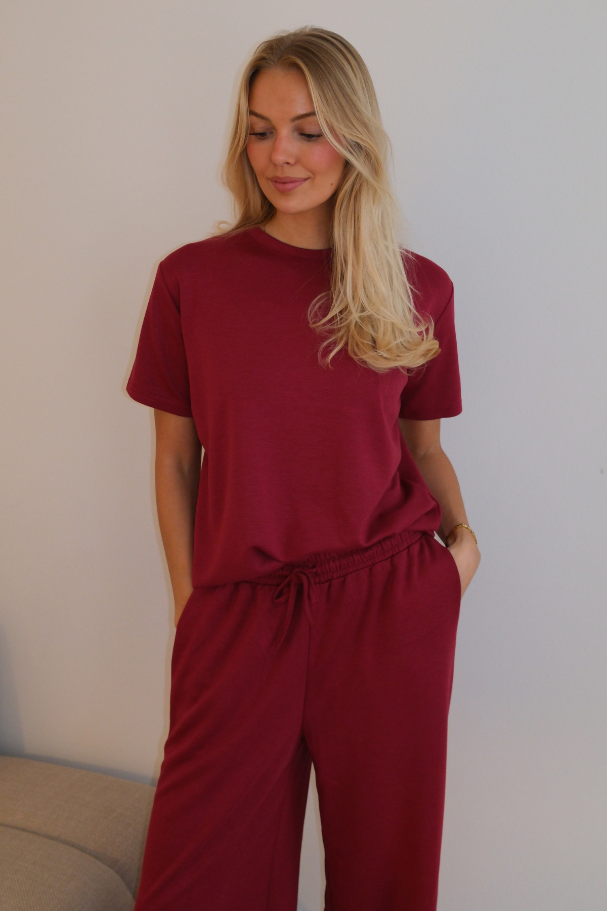 Afslappet Chic: Kombiner din Bordeaux Leah T-shirt med et par velpassende Jeans og dine yndlingssneakers for et ubesværet cool hverdagslook. Den løse pasform skaber en flot kontrast til tætsiddende jeans.