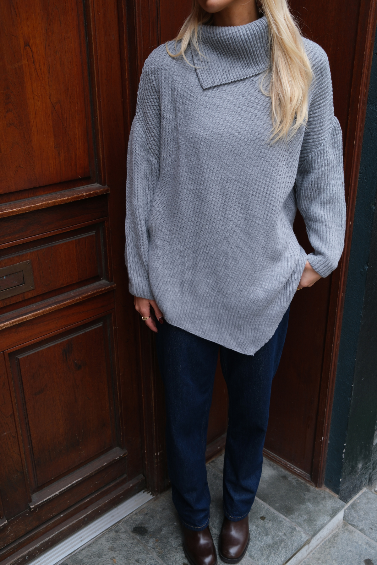 Den klassiske grå farve er et lærred for din personlige stil. Den højhalset krave giver et elegant udtryk, der forlænger silhuetten og tilføjer et strejf af raffinement, samtidig med at den holder dig varm på kølige dage. Pasformen er designet til at være flatterende uden at stramme – perfekt til at have på alene eller som en del af et lag-på-lag look.